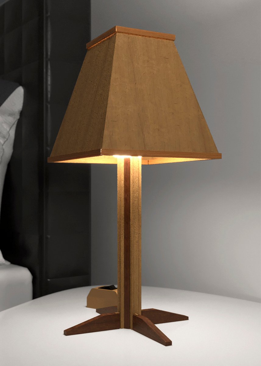 Abajur de madeira nobre, marchetado, com fiação embutida, com cúpula de madeira.
