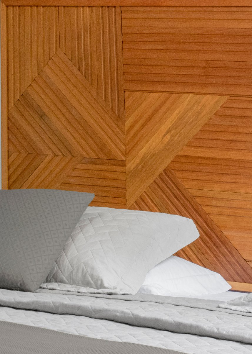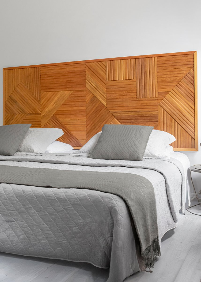 Cabeceira em madeira nobre, sobre placa de compensado.